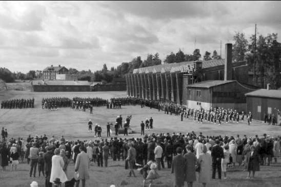 Kungabesök Gustaf VI Adolf besöker Karlsborg år 1962. Åskådare och trupp på skjutplatsen.