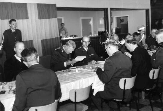 Kungabesök i Karlsborg år 1962. Gustaf VI Adolf och öv Bratt vid lunchen.