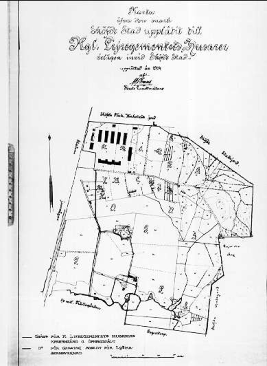 Karta över den mark Skövde stad upplåtit till KGL Livregementets husarer belägen invid Skövde stad upprättad 1904.