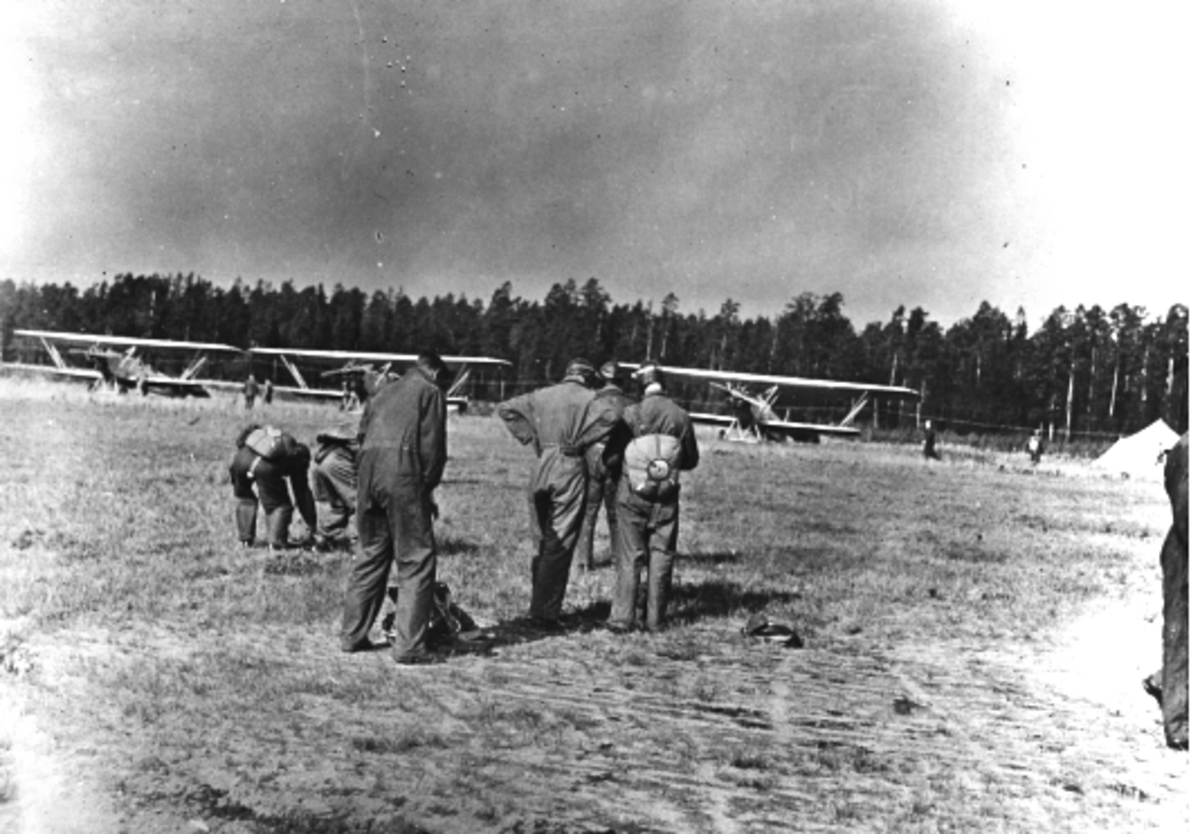 Karlsborg 1936. Flygare utrustade med Salvator-skärmar.