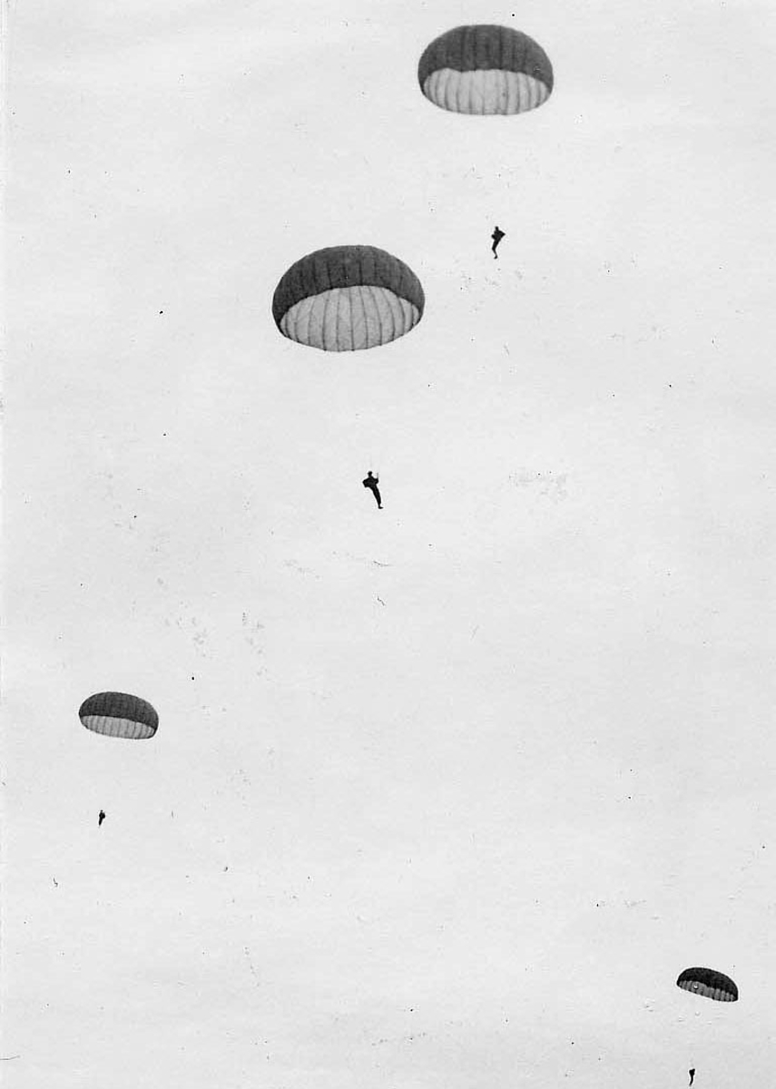 Fallskärmsjägarskolan i Karlsborg 1956.Hoppare i luften.