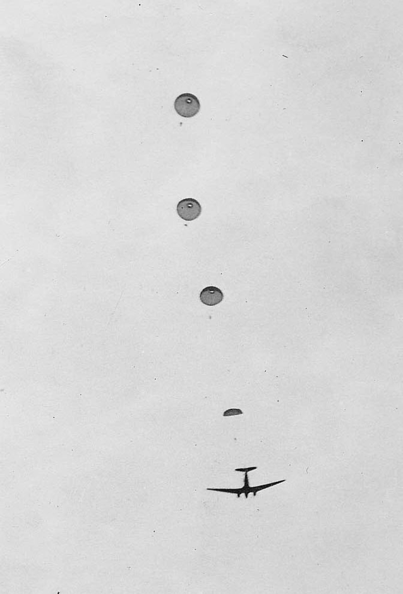 Fallskärmsjägarskolan i Karlsborg 1956.Laget hoppar ut.