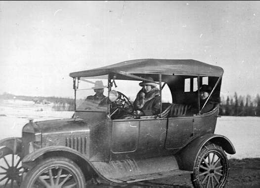 Fotot är taget vid "Grindstugan" Sätra sand. På bilden ses Valdemar Myrman med hustru Hildur. Dessa arrenderade det gamla soldatbostället "Grönhult" i Forsvik. Vad som gjorde Valdemar till en berömdhet i Forsvik var den T-Ford på fotot som var den första privatägda bilen i samhället. Den första bilen ägdes av bröderna Carlssons affär.