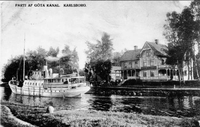 Båten "Skärgården" som trafikerade sträckan Motala - Karlsborg (järnvägsbryggan vid kanalbanken i Rödesund) passerar Kanalhotellet. Observera unionsflaggan på båten. Neg finns.