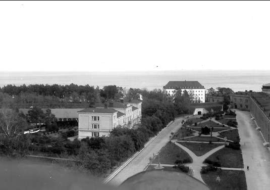 Fästningen. Del av östra delen av slutvärnet. Rakt fram i bild sädesmagasinet samt till vänster östra befälsbyggnaden. Gåva av öv Edvin Eriksson. Neg finns. Förstoring 36 x 58 cm.