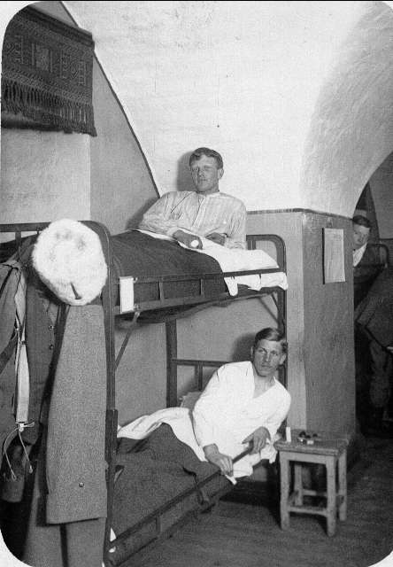 Interiör från ett logement, i översta sängen Birger Persson. Brevkort. Foto: Ateljé Standard Stockholm. Gåva av Birger Persson, genom Gunvor Björling Skara.