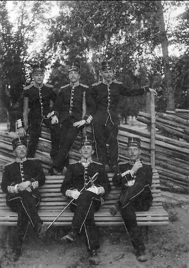 Officerare I 3, längst upp till vänster Wikner, Wallin och Björkegren. Sittande von Post, Ek och Vogel. Gåva av Carl Gustav "Kagge" Rydelius. Ett brev från Rydelius till museet finns på baksidan av kortet.