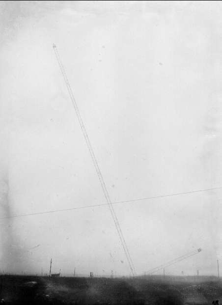 Karlsborgs radiostation i Kråk. Från mastresningen, år 1916. Masterna är konstruerade av professor K Ljungberg, Stockholm, var 210 m höga och vägde 25 ton. Foto: Alfred Sjöberg, Karlsborg. Masterna revs i mars år 2001.