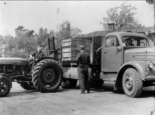 Fästningen. Tygstation, turbilsnätet. På traktorn Gunnar Moberg, Karlsborg och med ryggen mot kameran Ragnar Eriksson, Åsen.