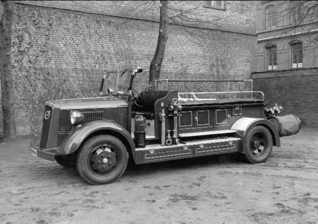 Karlsborg, garnisonsbrandkårens brandbil av äldre årgång.