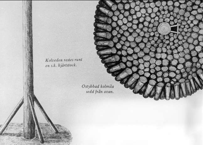 Utställningen "Skogsbruket förr och nu" år 1984-85. Ostybbad kolmila sedd från ovan. Avkopierade bilder från böcker.
