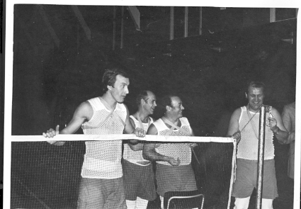 Underofficerare i S2:s gymnastiksal. Troligen 1960-tal. Från vänster: Christer Weinö, Lars Åberg, Olle Edh, Arne Jonson.