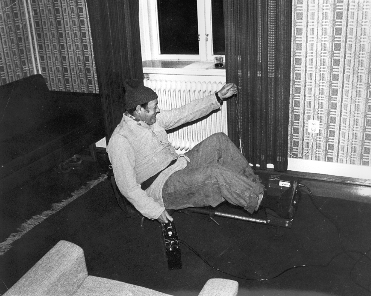 Underofficerare vid festligt tillfälle på mässen, 1960-tal. Olle Edh genererar ström från Ra 200 generator till sig själv.