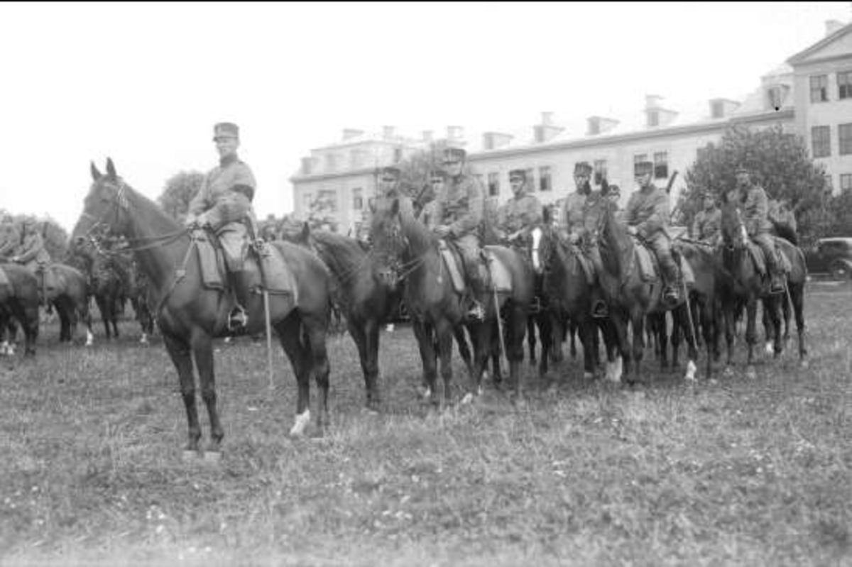 Regementet till häst uppställt på fältet söder om kasern för avlämning före avmarsch för tjänstövning.
