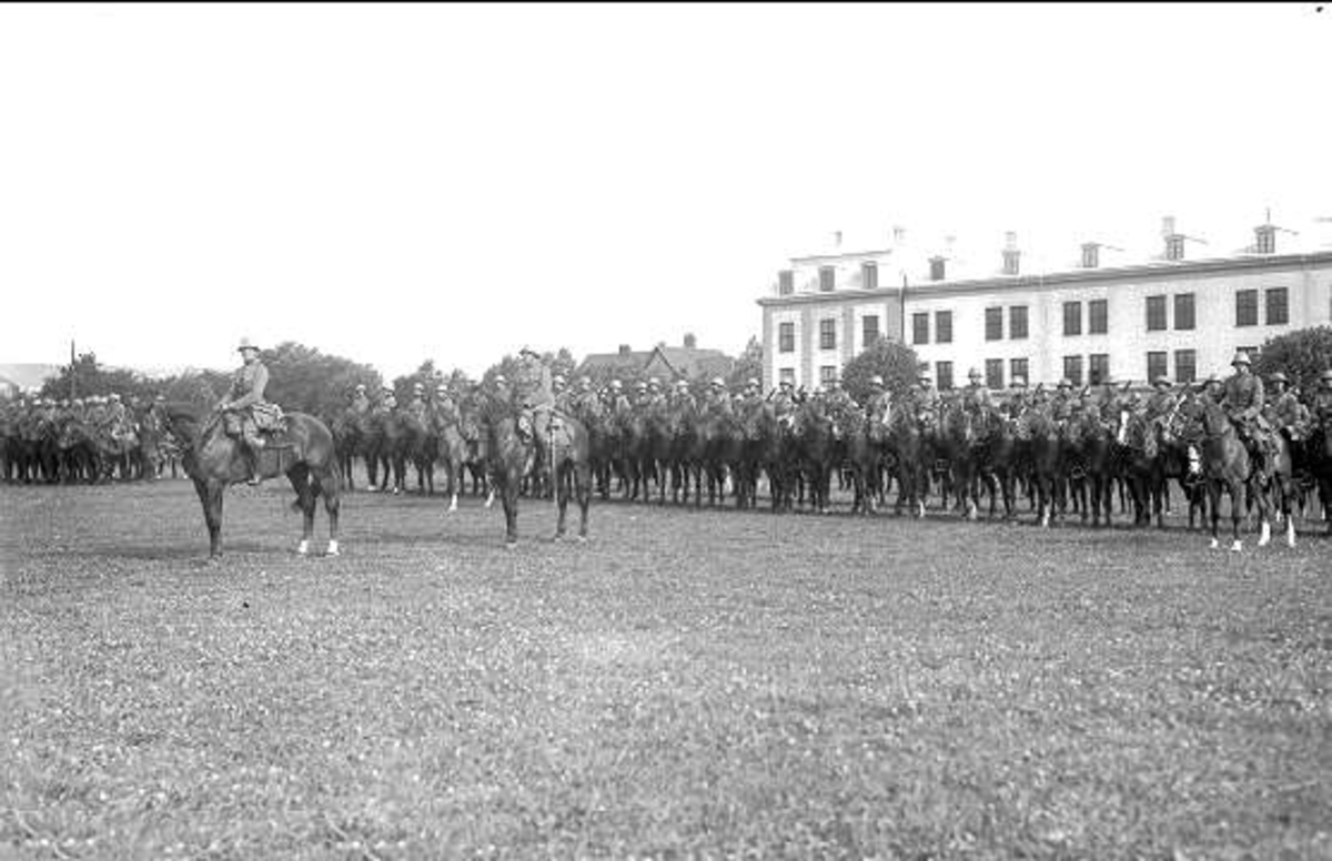 Regementet till häst uppställt på fältet söder om kasern för avlämning före sommarmarschens början 1930.