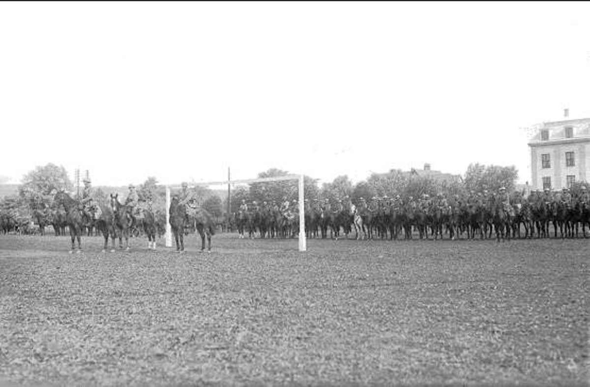 Regementet till häst uppställt på kaserngården söder om stallarna för avlämning före sommarmarschens början 1930. 2. skvadronens chef var ryttmästare Harry Hedenstierna.