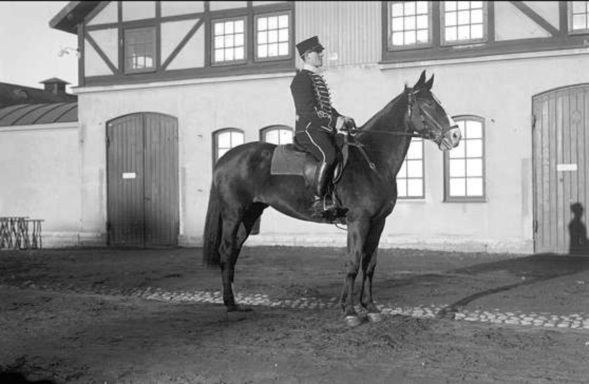 Livhusar på tilldelad stamhäst framför skvadronens stall.