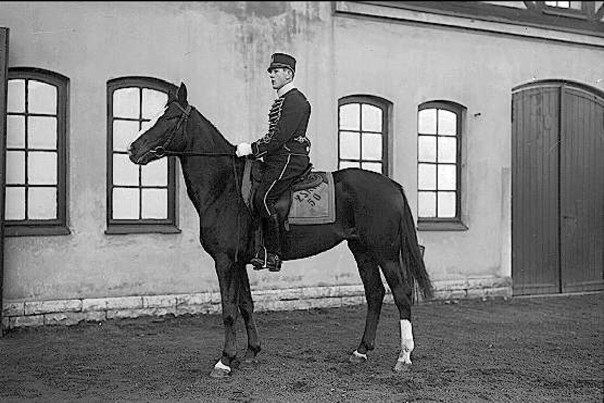 Livhusar, troligen från en skvadrons volontärskola, fotograferad till häst framför skvadronens stall.