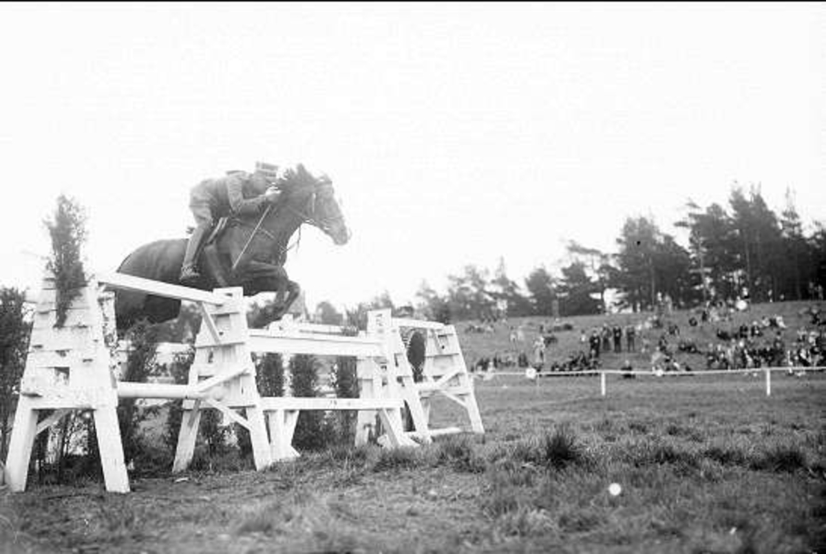 Skövde fältrittklubbs tävlingar 1929, prishoppning på tävlingsbanan öster om kasern.