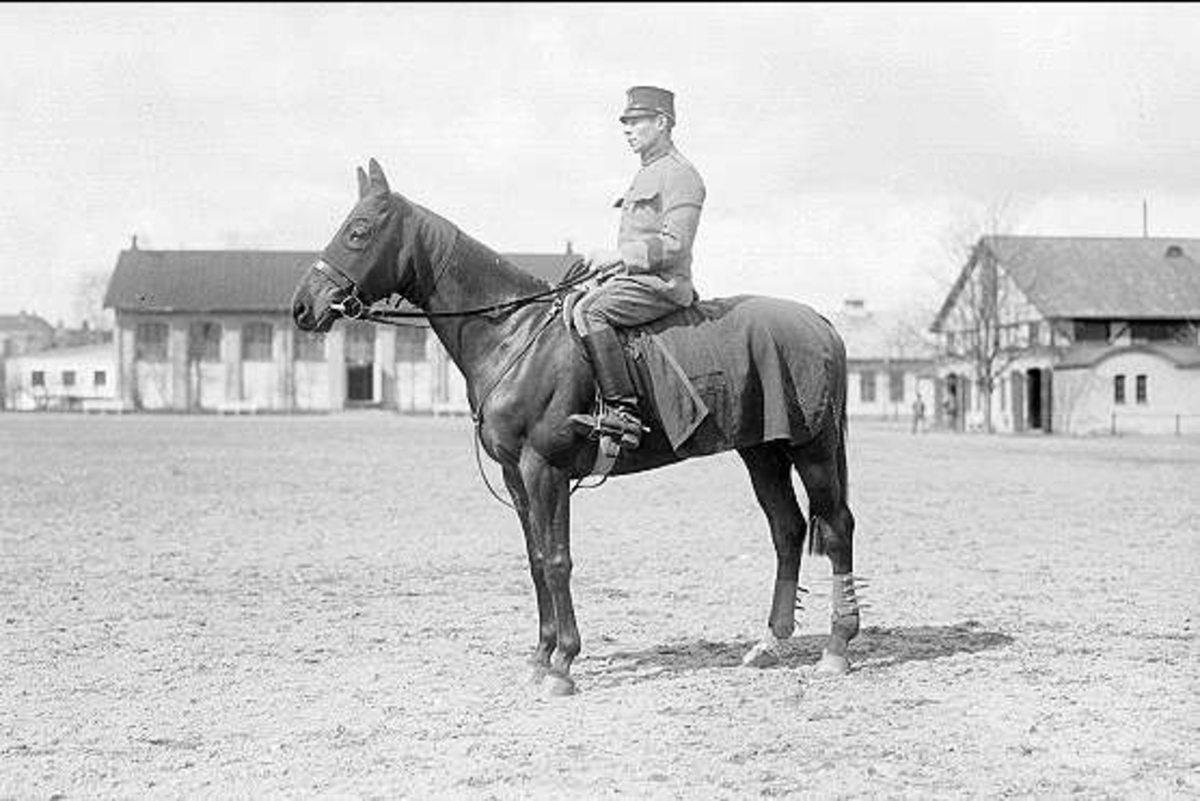 Hästskötare på väg ut för motion av officers kapplöpningshäst. Obs! Tyghuva och ländtäcke för att hålla hästen varm.