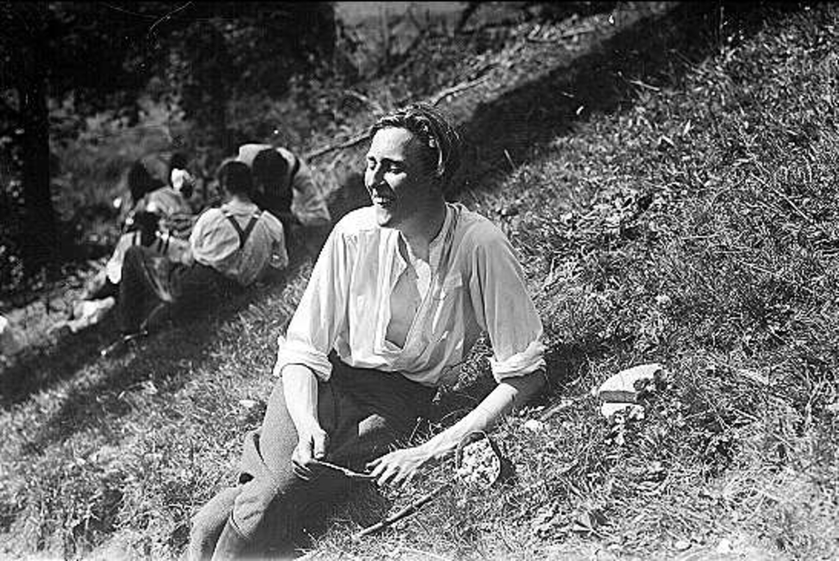 Okänd dam, antagligen officersfru. Bilden från någon sommarmarsch eller samövning. Hon har kronoskjorta och troligen byxa m/23, bredvid henne ett kokkärlslock och i handen en sked. Vissa lättnader i klädseln och ett gott leende antyder att hon trivs med livet i fält såsom det då tedde sig.