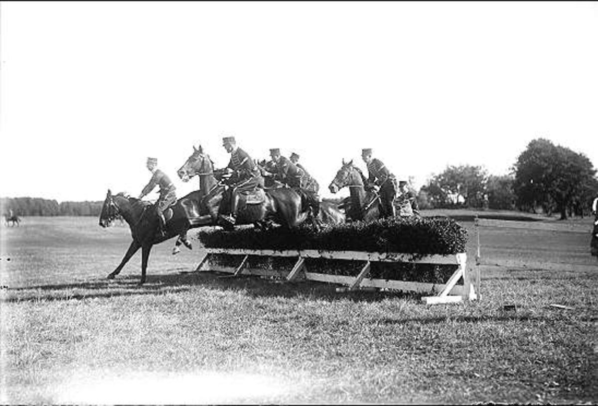 Regementskapplöpningarna 1933 på fältet söder K 3 kasern. Furirjaktlopp - fältet väl samlat över häcken. I bakgrunden "trumslagargropen".