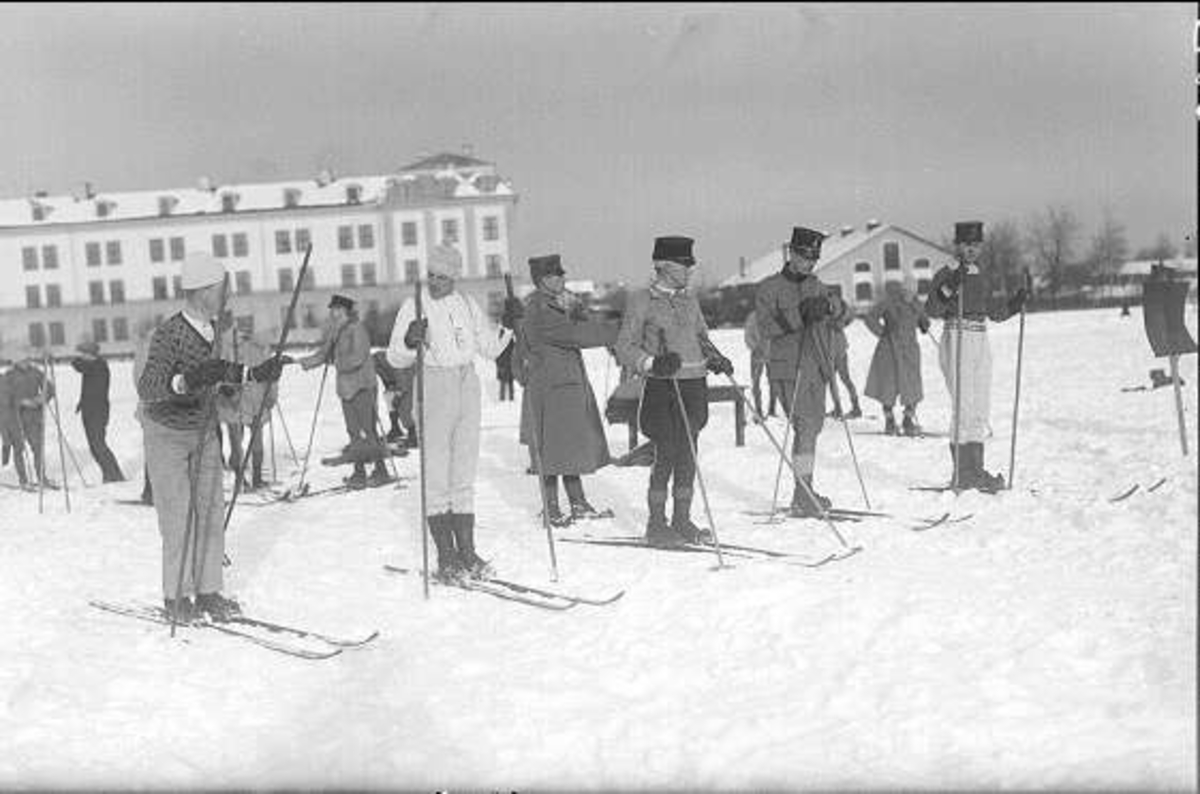 Titel: Skidtävling 1929 med start och mål söder om K 3 kasern, observera de långa stavarna.