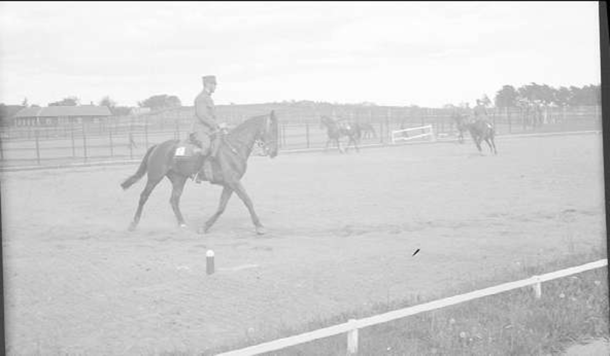 Kavalleriinspektör general G Gyllenstiernas inspektion av dressyrridning på dressyrbanan öster ridhuset. I bakgrunden Dunkehallshöjden.