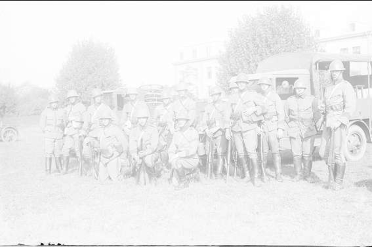 Kavalleriförsök med pansarbil. Avsutten följetrupp. Inspektion av kav.insp. general G. Gyllenstierna.