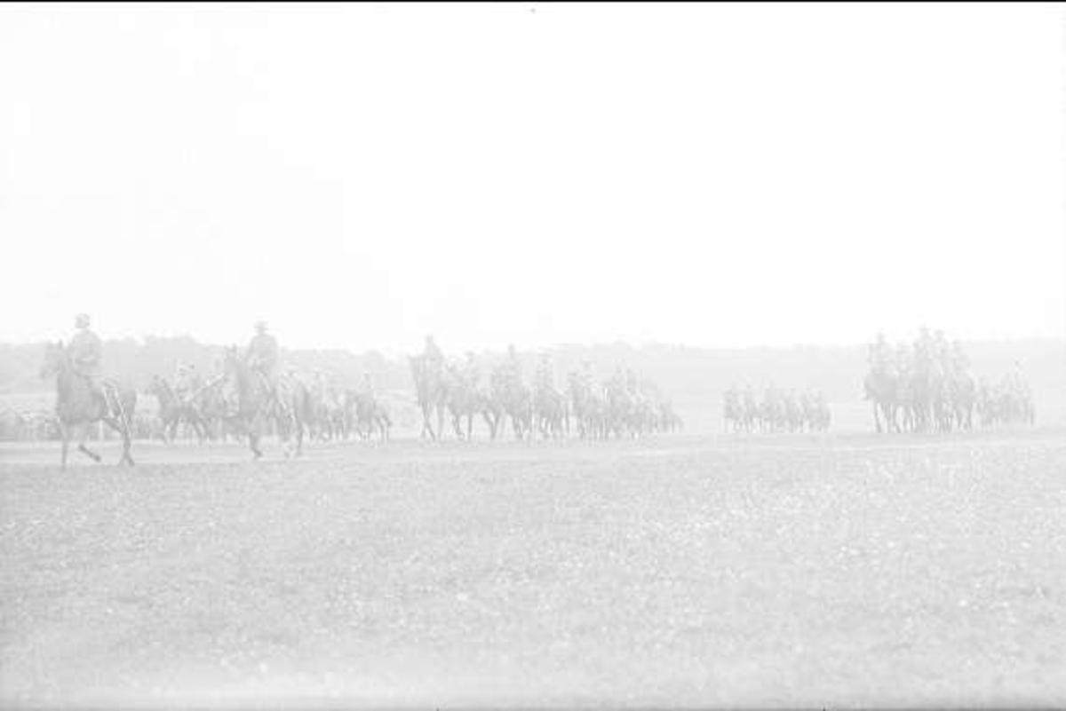 Det beridna regementet passerar i troppkolonner framför fronten av kamratdagens deltagare.