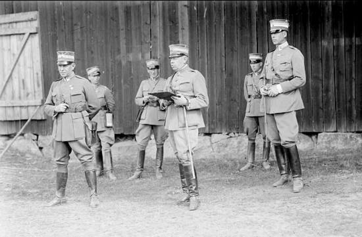 Utbildningskurs för kavalleriets underbefäl. Chefer från olika kavalleriförband följer övningarna. I mitten överste Knös.