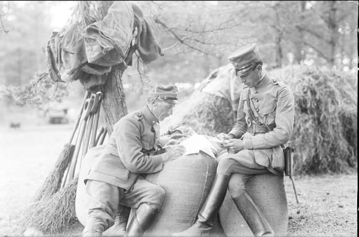 Bivack vid Tärnet. Skvadronorder skrivs ned av skvadronsadjutanten efter diktamen av skvadronschefen. Ryttm H Lagercrants. Fanj G Bergling.
