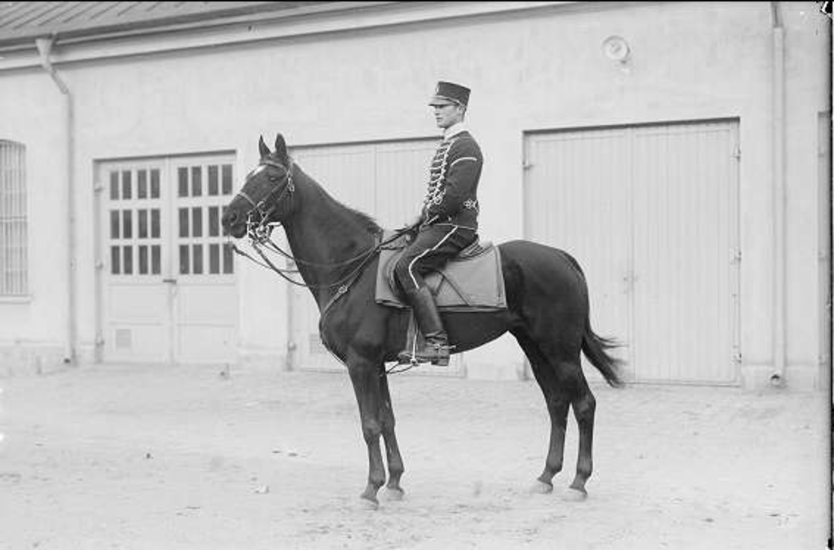Livhusar på officers tjänstehäst utanför pansarbilgaraget.
