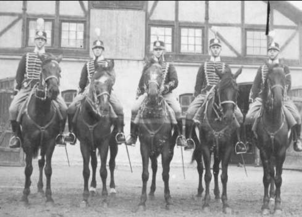 Fem livhusarer till häst söder om stallarna på K 3 i Skövde.