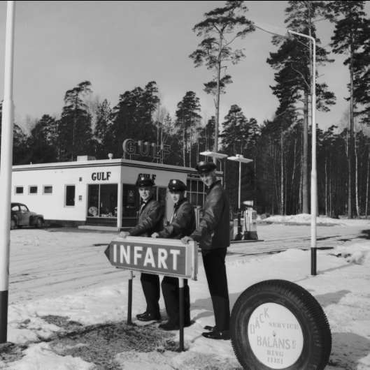 Gulf bensinstation (nuvarande OK/Q8) på Askersundsvägen, Karlsborg, 1962. På bilden syns bl.a. Lars Lindblad (bensinstationens ägare). Endast neg finns.