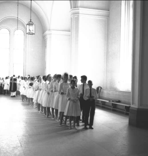 Konfirmandgrupp, Karlsborgs Garnisonskyrka, 1960. Konfirmandlärare: kyrkoherde Mellander. Endast neg finns.