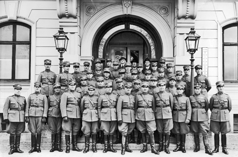 Karlsborg. A 9:s (föregångare till LV 1) underofficerare. 1930-tal. De 2 civilklädda var fästningspoliser. Kortet taget utanför garnisonsmässen. Bilden är en gåva från Olof Erdhage, Henrik Gjutares gata 30 B, Skövde.
