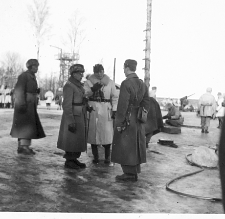 LV1 Karlsborg. Övningar på väddö feb. 1943. Överste Sten Odelberg (i vit päls), överstelöjtnant Tilly (till vänster), LV-inspektör överste Ragnar Sjöberg (med ryggen mot kameran). Albumet är en gåva från förvaltare Tage Södergren.
