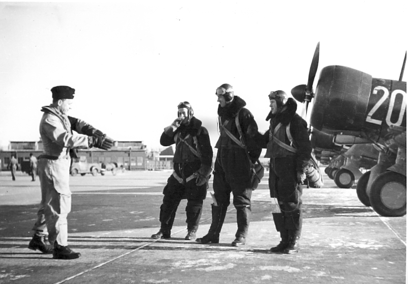 F6 Karlsborg 1943. Från vänster: Nyström, Engström, Karlsson, Engwall. Albumet är en del av en donation från Karl-Axel Hansson, Karlsborg. Förteckning över hela donationen finns i albumet samt som Word-dokument.