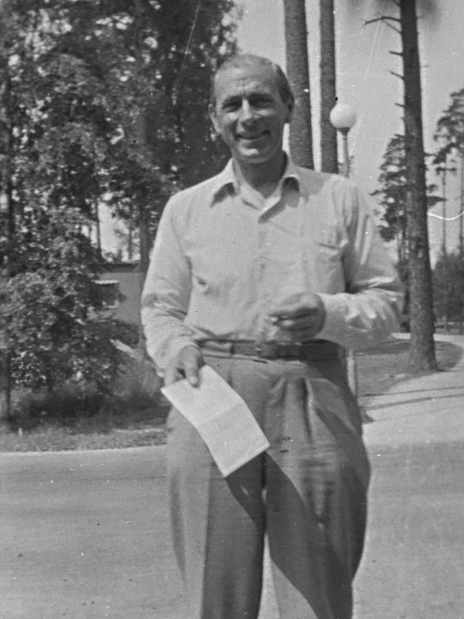 F6 Karlsborg 1953. Major Enderlin med biljett i hand för resa till Korea, tillsammans med ett 15-tal svenska officerare. De skulle ingå i en övervakningskommision. Albumet är en del av en donation från Karl-Axel Hansson, Karlsborg. Förteckning över hela donationen finns i albumet samt som Word-dokument.