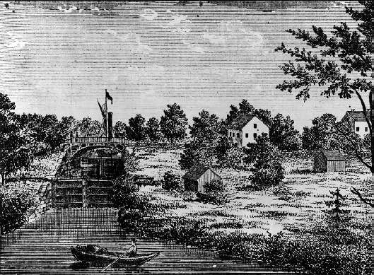 Vy över slussen i Forsvik. Resebroschyr 1852.