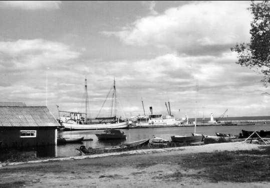 Parti av hamnen i Hjo. Skutan: Munksjö 11. Vykort.