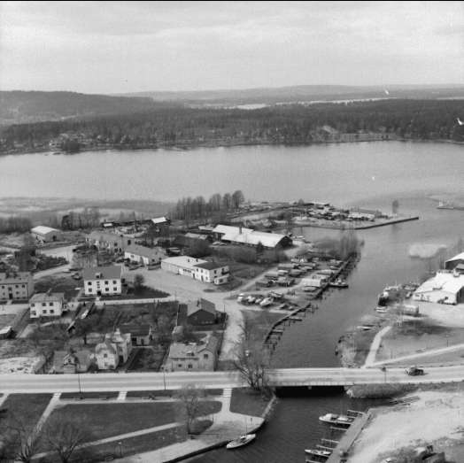 Karlsborg, flygfoto, Strömbron med delar av Rödesund. Bottensjön med Vaberget i bakgrunden. Neg finns. Förstoring 40 x 50 cm.