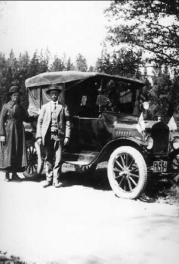 Fotot är taget vid "Grindstugan" Sätra sand. På bilden ses Valdemar Myrman med hustru Hildur. Dessa arrenderade det gamla soldatbostället "Grönhult" i Forsvik. Vad som gjorde Valdemar till en berömdhet i Forsvik var den T-Ford på fotot som var den första privatägda bilen i samhället. Den första bilen ägdes av bröderna Carlssons affär.