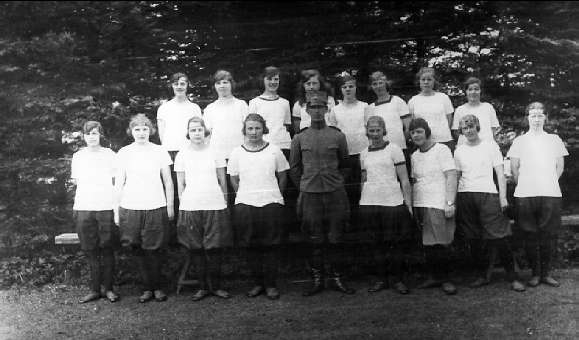 Karlsborg, Realskolan. Gymnastikgrupp år 1921, 1:a klassen. Kortet taget utanför 6:e komp. Lärare kapten Alfred Eklund. Kortet lämnat av Elvira Hägg - Andersson född och uppväxt i Hanken. 2 st förstoringar 30 x 40 och 1 st 35 x 50 cm. Neg finns.