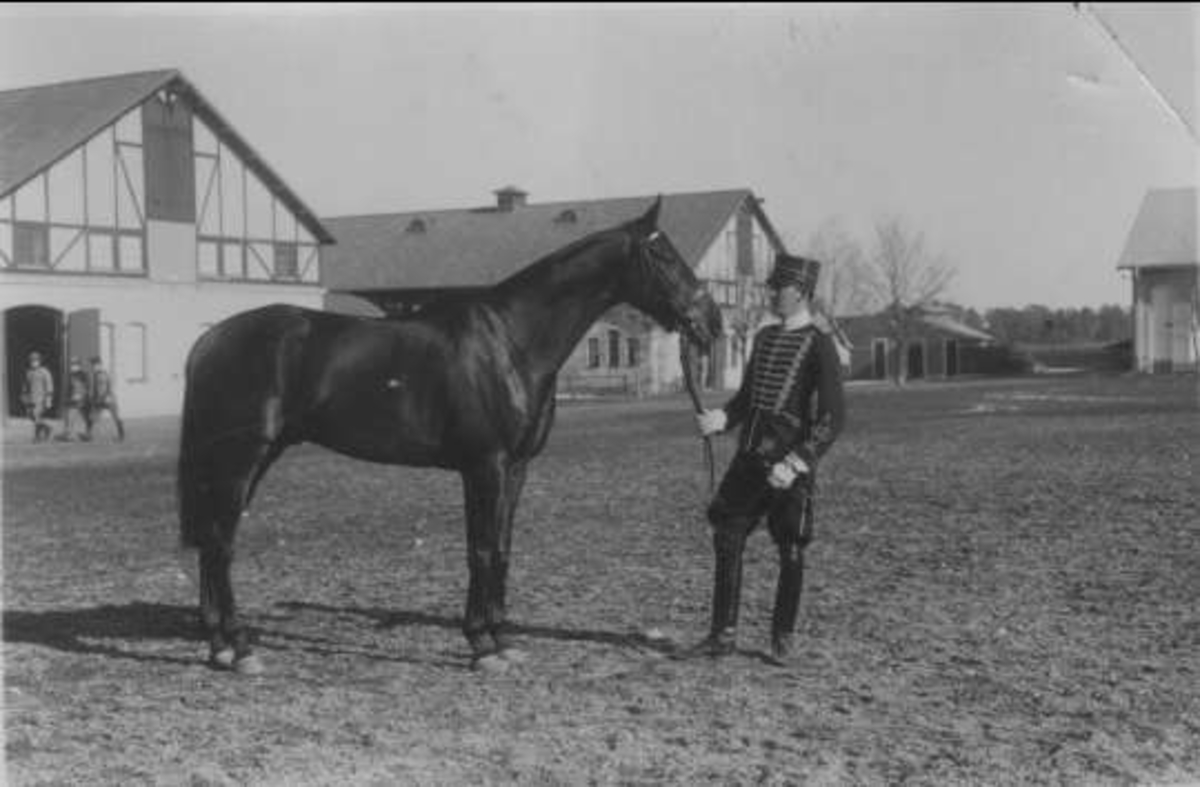 Fänrik med tilldelad tjänstehäst på K 3 kaserngård söder stallarna.