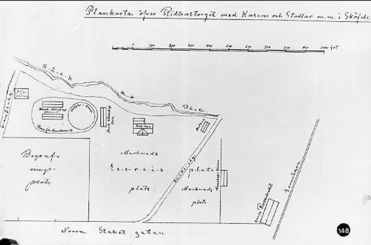 Plankarta fver ridhustorget med kasern och stallar m.m i Skövde (vid Mörke).