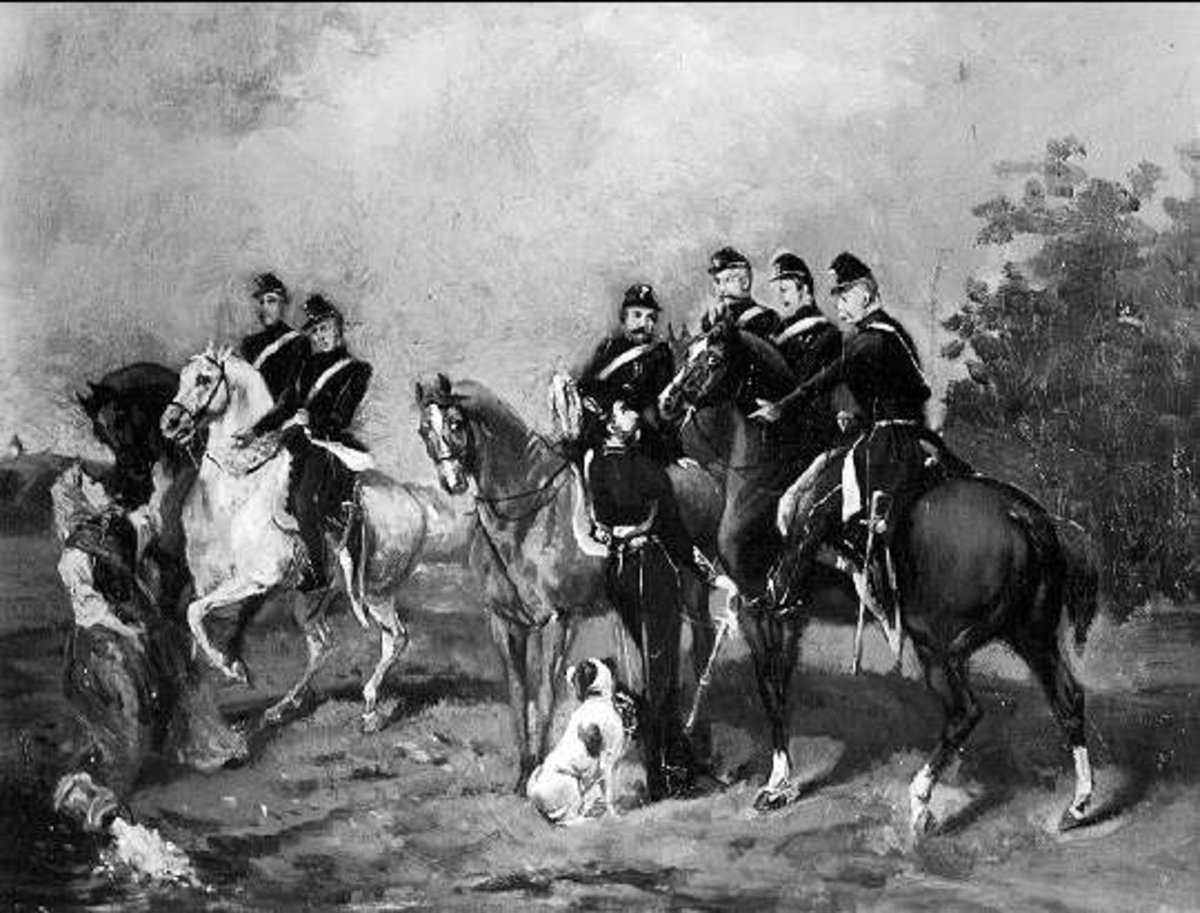 Bild av en tavla som tillhört familjen Hedenstierna. Ingemar Holst, Ahnström, Granath, L G Wrangel, H,H von Essen , Löwen, (Palmstierna i stabsuniform),Ahnström var en skicklig ryttare, som ofta red i stadiga hästar. här har han stött på en gumma med en mjölkstäva, i vilken han räcker en slant . Tavlan tillhörde ryttarmästare H Tham på Stäholm och testamenterades av honom till D.V. löjtnanten vid lifregementets husaren H Hedenstierna(1938).