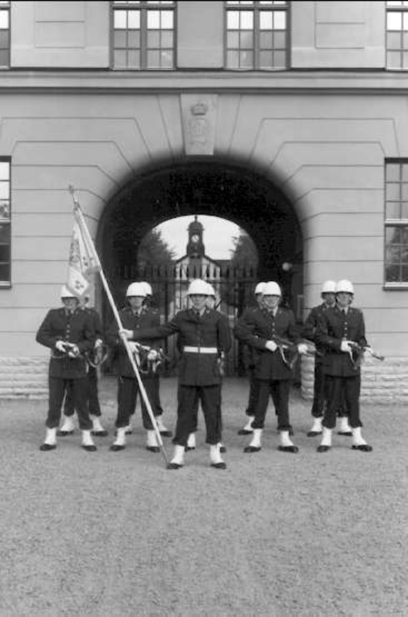 Livhusarernas standar med standarförare och standarvakt, söder valvet K3 i Skövde.