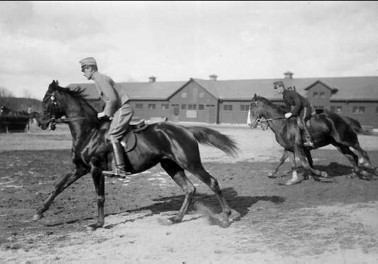 "Framridning" på Strömsholms stallplan, officersstallet i bakgrunden. Strömsholm 1910-11.